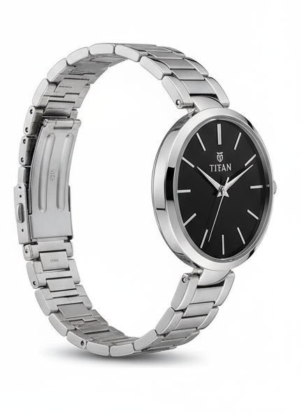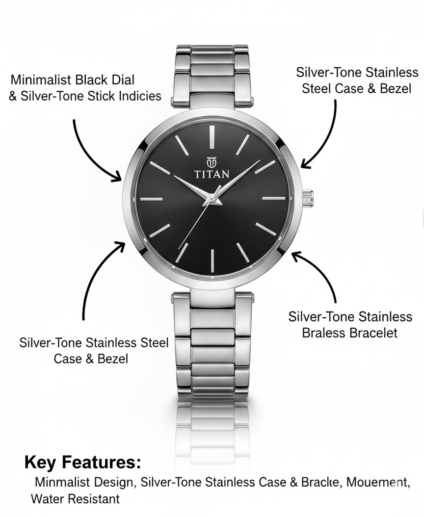 This is an elegant Titan analog watch featuring a sleek, minimalist design.It has a striking minimalist black dial with silver-tone stick indices. The watch is encased in a silver-tone stainless steel case and bezel, and secured with a matching silver-tone stainless steel bracelet.Key features include its minimalist design, silver-tone stainless case & bracelet, and being water resistant.